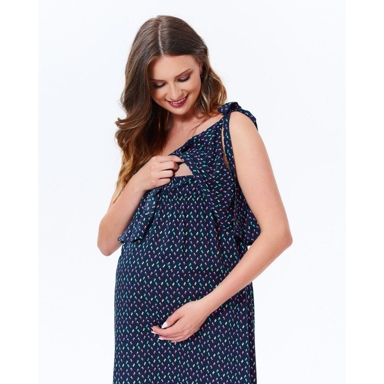 Sukienka o modnej długości maxi – wydłuży optycznie sylwetkę. Wiązane ramiączka pozwalają regulować głębokość dekoltu. Romantyczności sukience dodaje falbana, pod którą jest ukryty system do karmienia. Delikatny zamek błyskawiczny ułatwia komfortowy dostęp do karmienia w różnych sytuacjach.