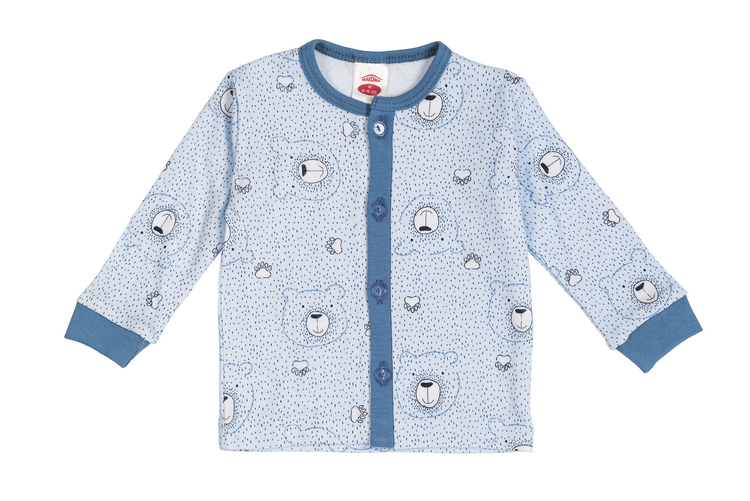 Kaftanik niemowlęcy z motywem misia. Wykonany ze 100% bawełny. Zapinany na guziki. Wykończony lamówką.
