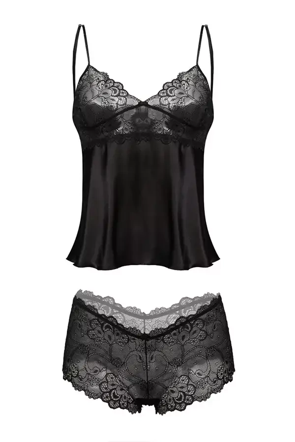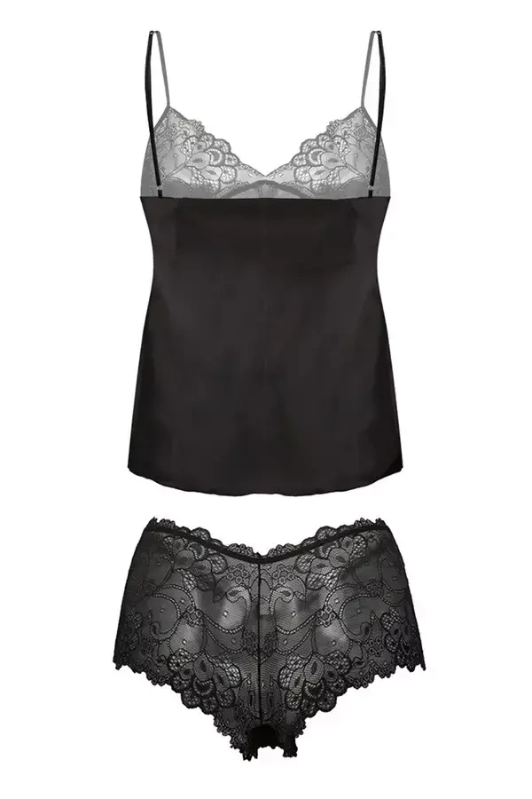Góra koszulki uszyta z elastycznej koronki, dół natomiast został wykonany z delikatnej satyny. Ramiączka cienkie regulowane. Bokserki na cienkiej gumce uszyte z elastycznej koronki.