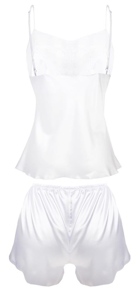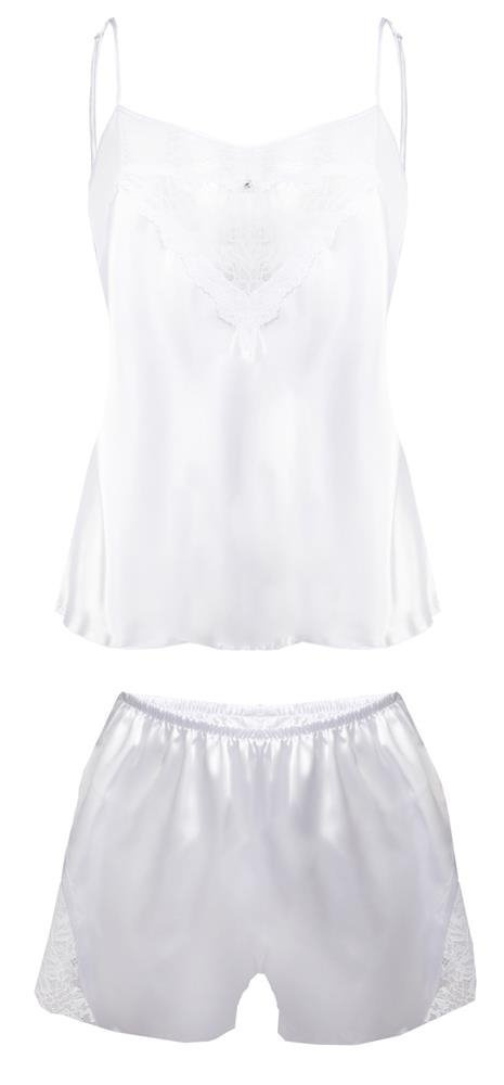 Góra koszulki zdobi delikatna koronka na dekolcie która jest obszyta lamówką. Spodenki satynowe po boku trójkąt z koronki. Ramiączka cienkie i regulowane.