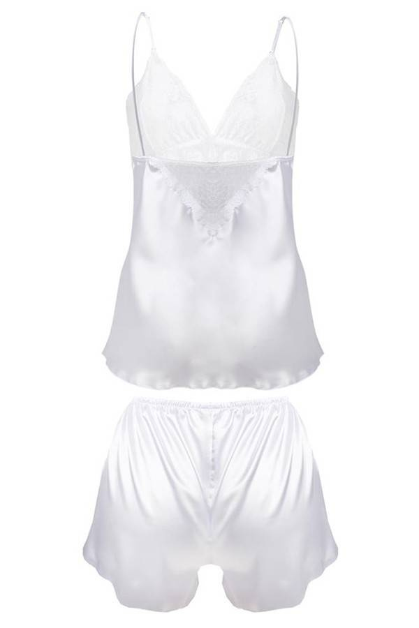 Satynowy komplecik który składa się koszulki oraz spodenek. Góra koszulki zdobi wzorzysta koronka oraz z tyłu został wszyty trójkąt z koronki. Reszta uszyta z zwiewnej satyny.