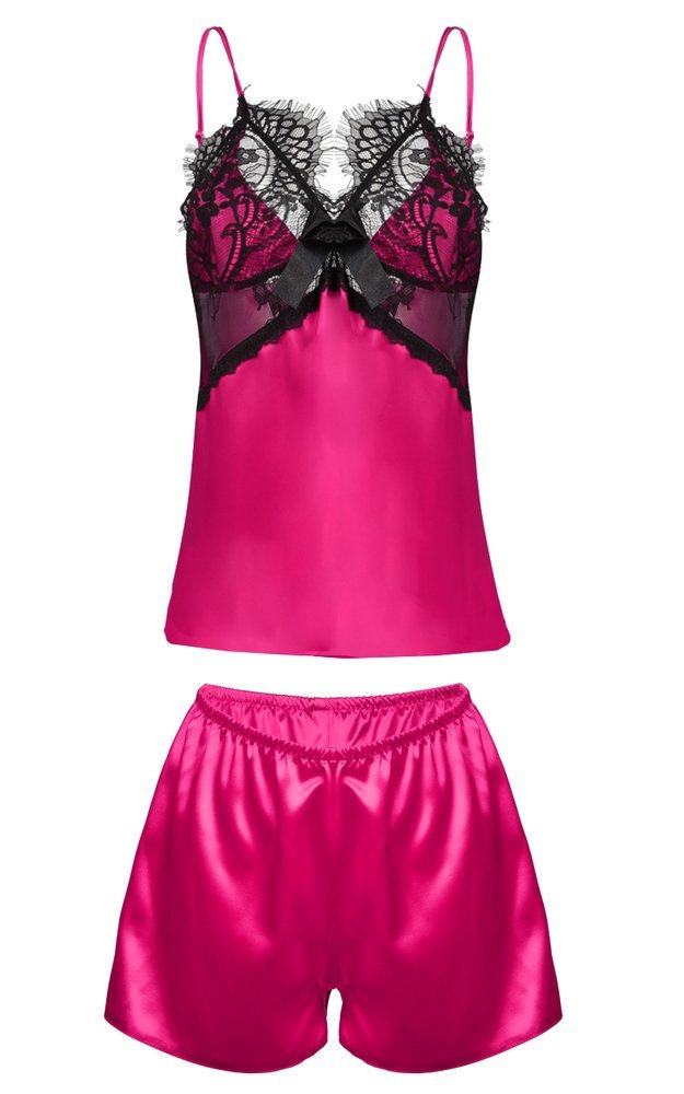 Uwodzicielski komplecik satynowy składający się z dwóch części. Góra koszulki jest uszyta z przepięknej koronki. Miseczki są podszyte satyną która kryje kobiece atuty. Dół i tył koszulki wykończony satyną. Spodenki uszyte z delikatnej satyny. Ramiączka cienkie regulowane.
