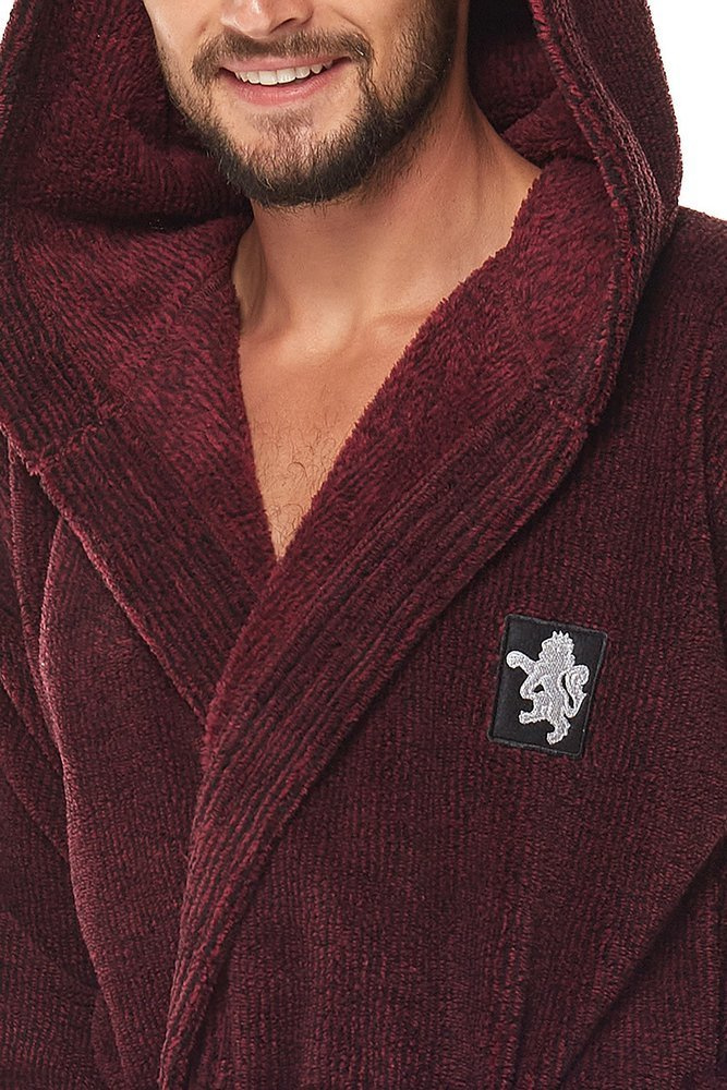 Długi, jednolity szlafrok męski Bruce o klasycznym kroju z kapturem. Szlafrok wiązany paskiem, dodatkowo posiada dwie kieszenie.Z jednej strony ciemna nitka, od wewnątrz długi puchaty włos.