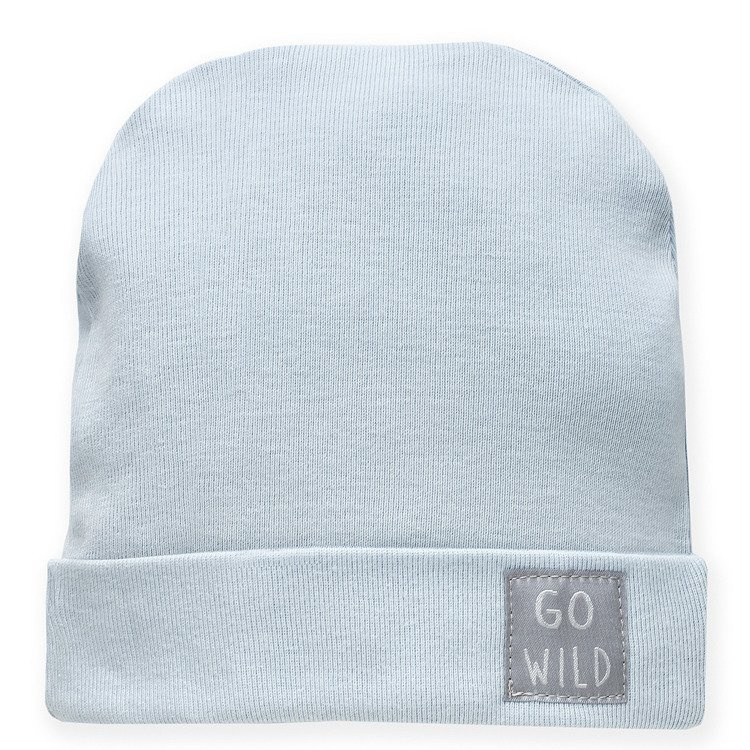 Czapka niemowlęca wykonana z bawełny 100%.  Gładka, z niewielką naszywką z napisem "GO WILD".