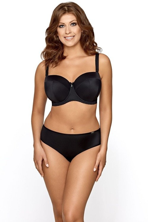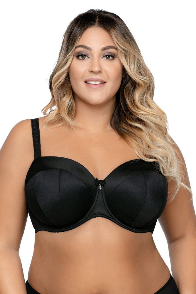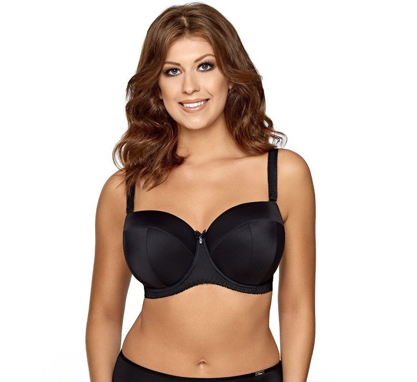 Elegancka bardotka w kolorze głębokiej czerni. W całości został wykonany z subtelnej, gładkiej dzianiny. Biustonosz posiada od wewnętrznej strony paski silikonu, dzięki czemu można nosić go bez ramiączek.
