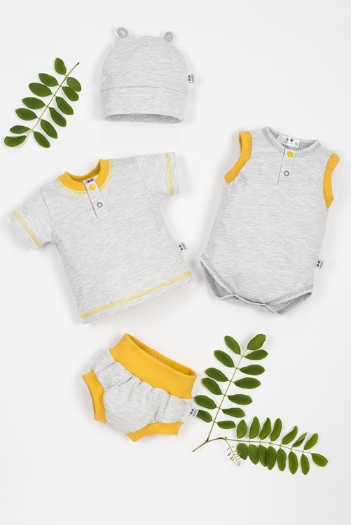 Zestaw niemowlęcy, który składa się z czapki, body na ramiączkach, bloomersa i bluzeczki. Każdy z produktów jest pakowany osobno. Ubranka wykonane ze 100% mięciutkiej bawełny zapewnią zadowolenie każdego z naszych Milusińskich.
