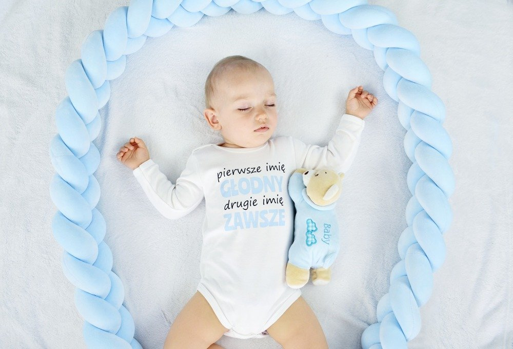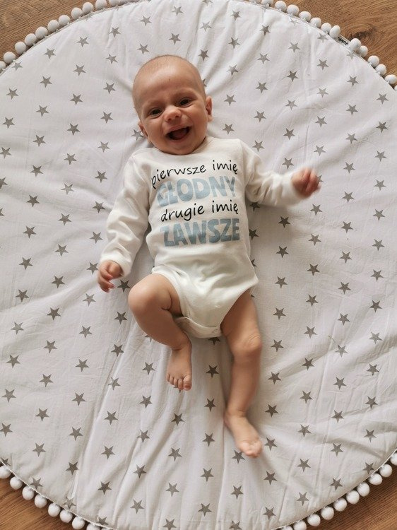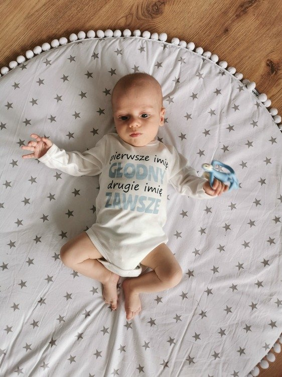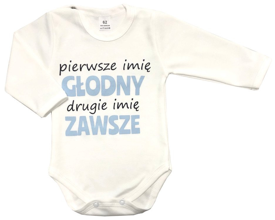 Oryginalne body ozdobione na froncie nadrukiem "pierwsze imię GŁODNY, drugie imię ZAWSZE". Ubranko rozpinane jest na lewym ramiączku oraz w kroczku za pomocą bezniklowych nap, a kołnierzyk został wykończony łagodną lamówką. Body będzie się doskonale prezentować w wielu codziennych stylizacjach.