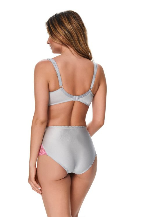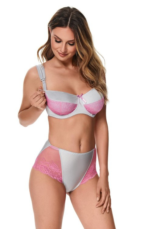 Biustonosz miękki do karmienia wykonany z jednolitej mikrofibry, ozdobiony różową koronką o kwiatowym wzorze. Miękkie miseczki wewnątrz są wysłane delikatną bawełną, środek miseczki pozbawiony jest szwów, mogących podrażniać delikatne w tym okresie ciało.