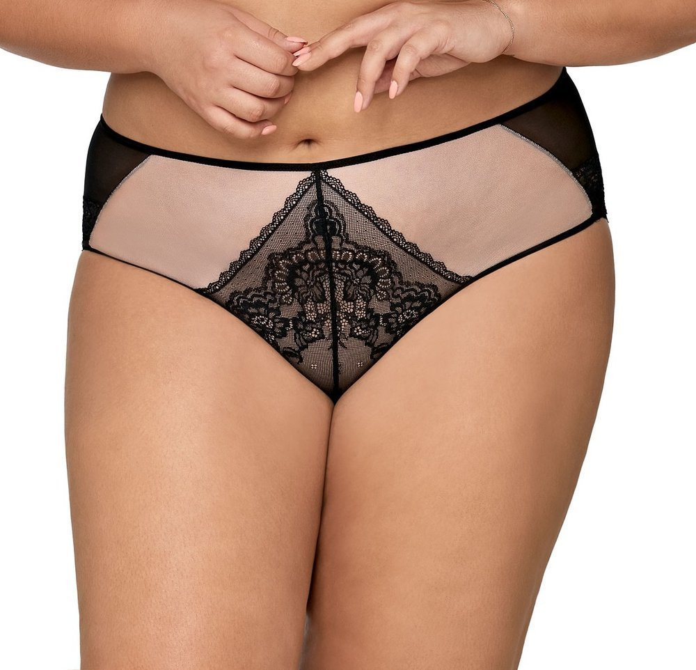 Figi damskie o klasycznym kroju. Wykonane z delikatnej siateczki w połączeniu z efektowną koronką o kwiatowym motywie. Tył gładki z tiulowym wykończeniem.
