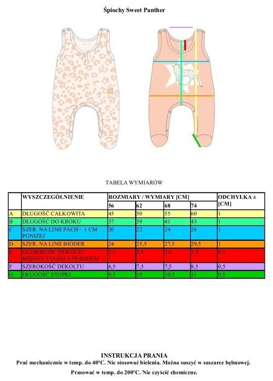 Wygodne śpioszki wykonane ze 100% bawełny. Na ramiączkach rozpinane są bezniklowymi napkami, a stópki zabezpieczone są delikatnymi ściągaczami, zapobiegającymi zsunięciu się ubranka.