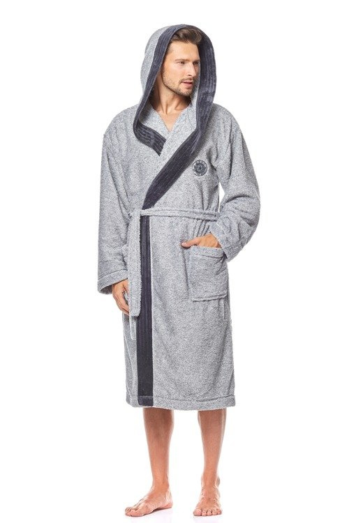 Długi, jednolity szlafrok męski George o klasycznym kroju z kapturem. Szlafrok wiązany w pasie, dodatkowo posiada dwie kieszenie oraz na wysokości klatki piersiowej naszytą aplikację. .