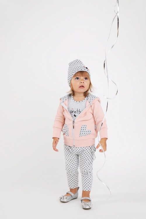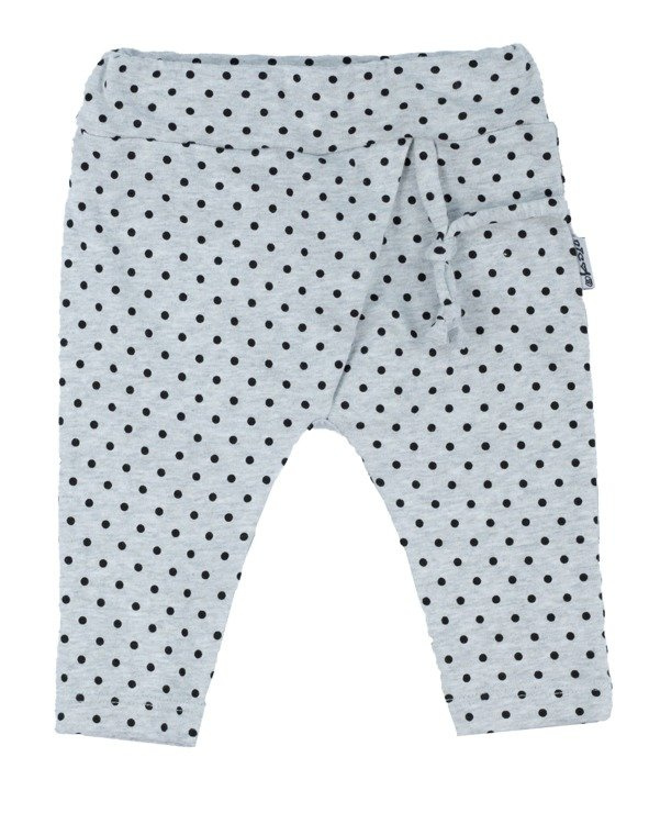 Wykonane ze 100% bawełny, bezpiecznej dla skóry dziecka. Wygodne szare spodenki w drobne groszki.