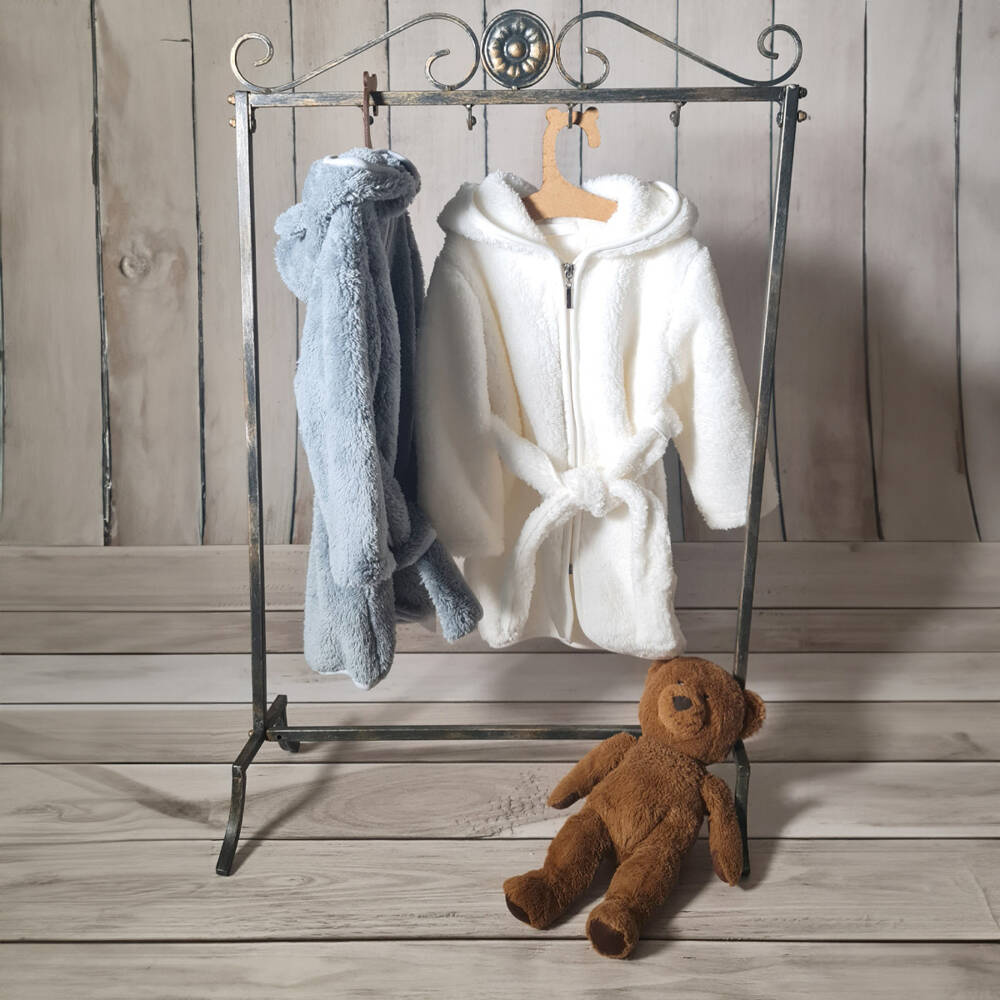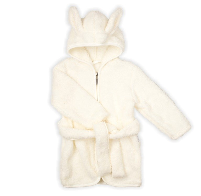 Szlafrok dziecięcy wykonany z cieplutkiego materiału, który jest całkowicie bezpieczny dla skóry dziecka. Zdobią go uszka, wiązany w pasie. Produkt będzie świetnym okryciem po kąpieli lub prezentem dla dziecka.