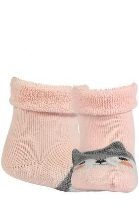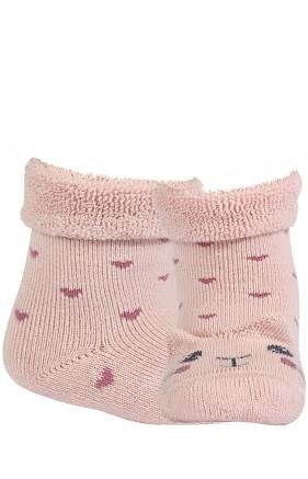 Skarpetki niemowlęce wykonane z wysokiej jakości bawełny.Zostały ozdobione na paluszkach wizerunkiem zwierzaków z "odstającymi" uszkami. Posiadają wywinięty nieuciskający ściągacz. Od wewnętrznej strony miękka ftotta.