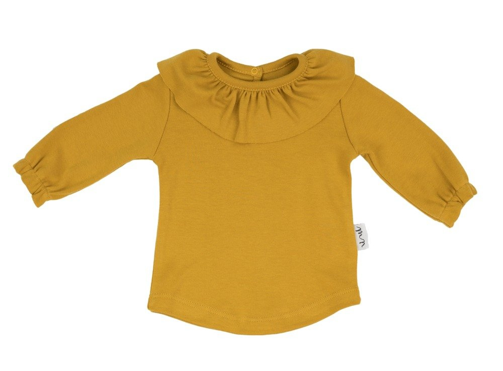 Musztardowa bluzeczka z długim rękawem, wykończona falbanką pod szyją, rękawy zakończone ściągaczem. Ubranko posiada praktyczne napy na plecach ułatwiające ubieranie. Uszyte ze 100% bawełny organicznej, posiadającej certyfikat Oeko-Tex Standard 100 Tekstylia godne zaufania..