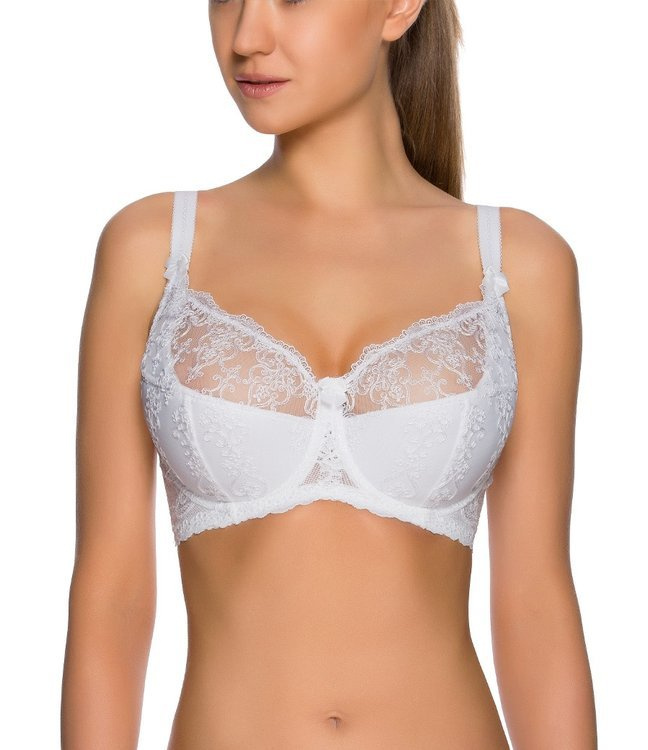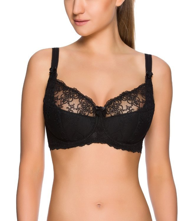 Piękny, półusztywniany biustonosz VB-115. Biustonosz uszyty z miękkiego materiału i kokieteryjnej koronki. Bez odpinanych ramiączek, wzmocniony pionową fiszbiną. Boczki wykonano z koronki, między miseczkami delikatna kokardka.
