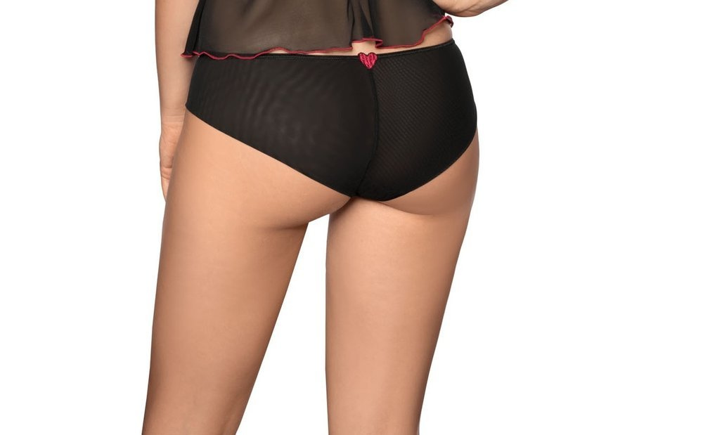 Figi damskie o klasycznym kroju wykonane z tiulowej siateczki. Przód z ozdobnymi czerwonymi serduszkami. Tył z podwójnej siateczki, dzięki czemu figi nie odznaczają się pod ubraniem.