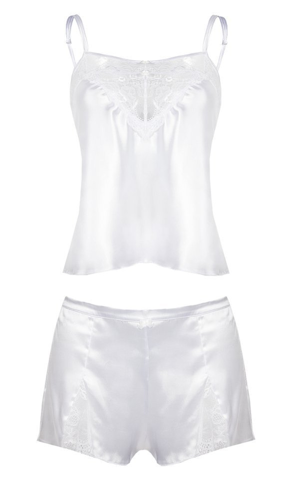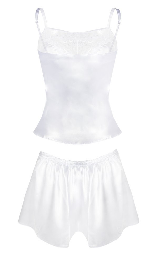Satynowy komplecik w który skład wchodzi koszulka oraz spodenki. Górę koszulki zdobi delikatna, zmysłowa koronka na dekolcie.