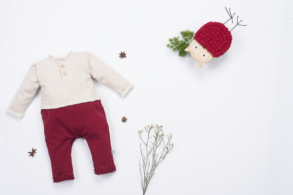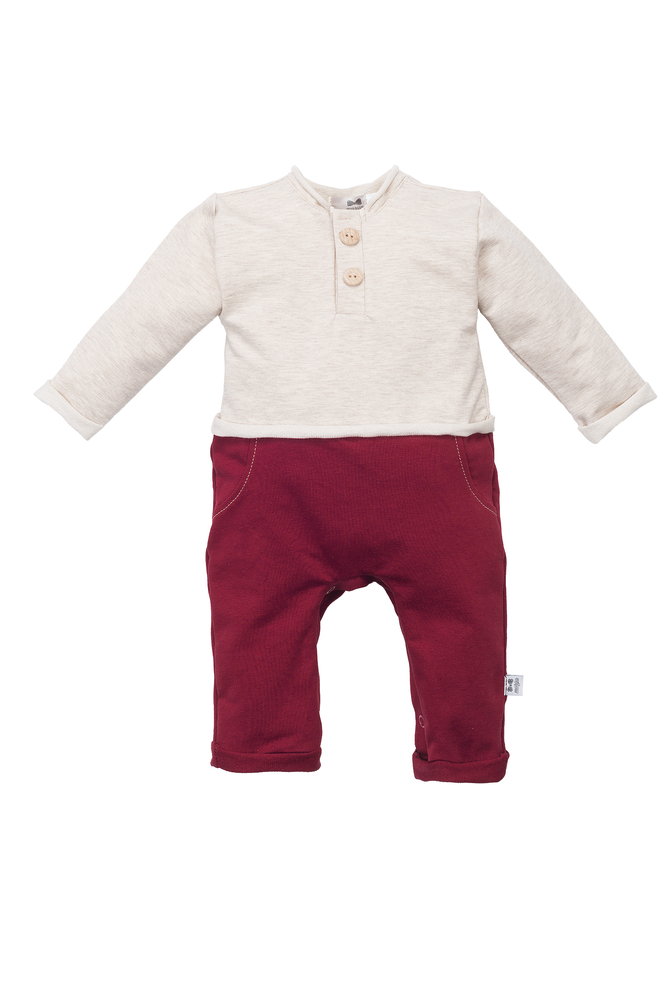 Bawełniany pajac z zapięciem typu polo utrzymany w beżowo bordowej kolorystyce. Możliwość całkowitego rozpięcia umożliwia łatwe i szybkie ubieranie dziecka. Dodatkowy klin w kroku zapewnia swobodę użytkowania i nie krepują ruchów dziecka.