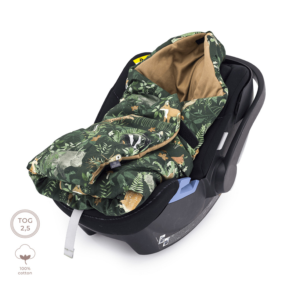 Otulacz do fotelika wyposażony jest w otwory na trzy i pięciopunktowe pasy bezpieczeństwa, zapinany jest na szeroki rzep z dużym obszarem regulacji, a w górnej części posiada zapinany kapturek, który otula i chroni główkę.
