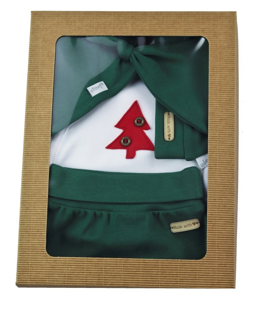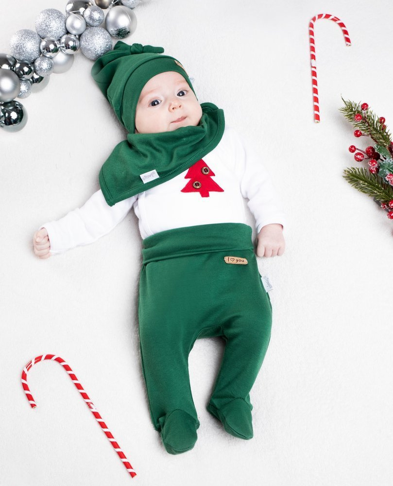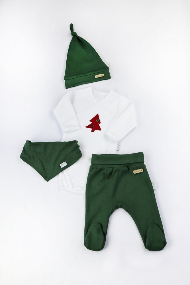 163040 Komplet czapka, body, apaszka i półśpioch "Magia Świąt" Nicol - zielony / choinka