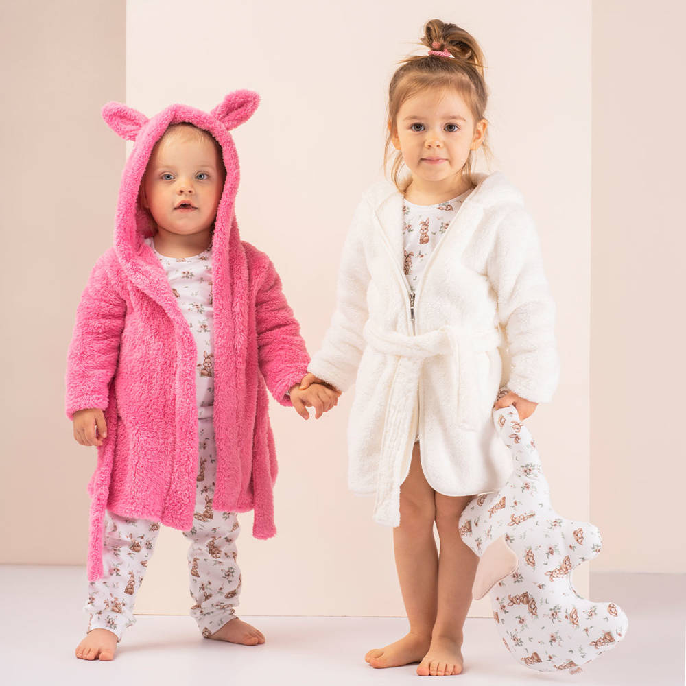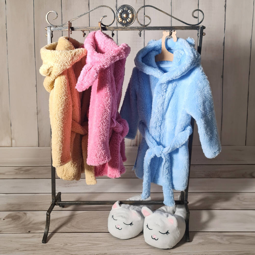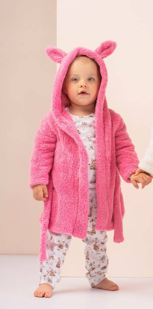 Szlafrok dziecięcy wykonany z cieplutkiego materiału, który jest całkowicie bezpieczny dla skóry dziecka. Zdobią go uszka, wiązany w pasie. Produkt będzie świetnym okryciem po kąpieli lub prezentem dla dziecka.