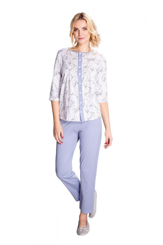 Piżama Helena to wyjątkowo kobieca piżama wykona z wysokiej jakości bawełny wyprodukowanej w Polsce. Piżama posiada spodnie do kostek wykończone delikatną gumką w pasie oraz rękawek 3/4. Rozpinany dekolt wykończony jest lamówką w kolorze jasnego błękitu oraz małymi guzikami.