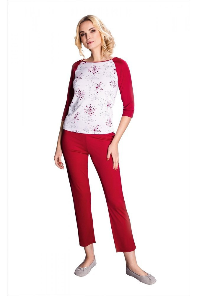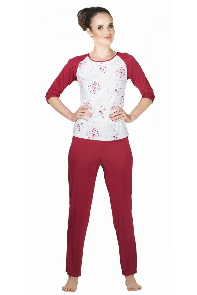 Piżama w intensywnym, burgundowym kolorze z białą wstawką z nadrukowanymi dmuchawcami. Piżama wykonana została z jedwabiu wiskozowego znanego ze swych niespotykanych właściwości tj.: termoaktywność czy higroskopijność. Komplet posiada rękawy 3/4 i spodnie do kostek wykończone w pasie delikatną gumką. Łączy w sobie elegancję jak i sportowy charakter. Idealna na każdą porę roku.