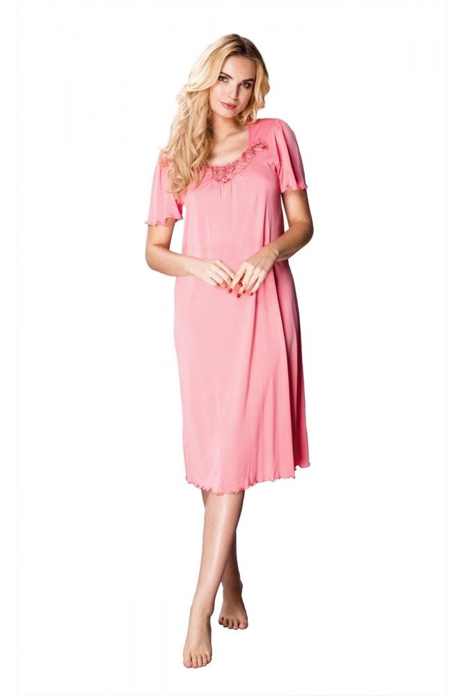 Koszula nocna wykonana z niezwykle funkcjonalnej dzianiny wiskozowej o długości delikatnie za kolano. Motywem zdobniczym jest efektowna aplikacja przy dekolcie.