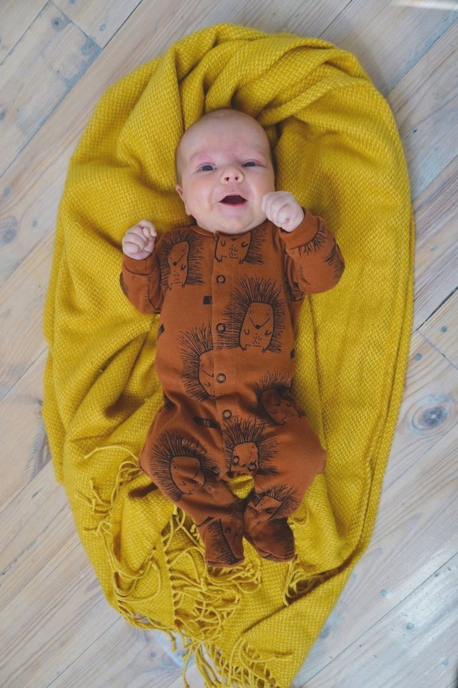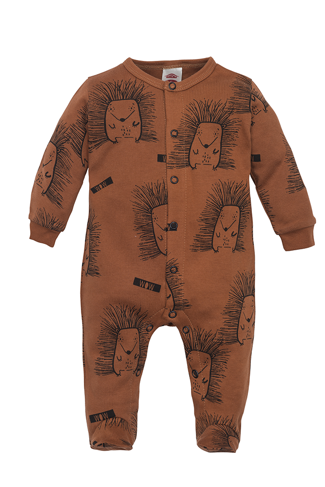Bawełniany pajac w kolorze szarym z motywem jeżyka. Możliwość całkowitego rozpięcia umożliwia łatwe i szybkie ubieranie dziecka. Zapewnia swobodę użytkowania i nie krepuje ruchów dziecka. Dostępny w rozmiarach 56-80. Wykonany z najwyższej jakości bawełny.