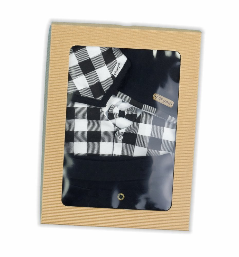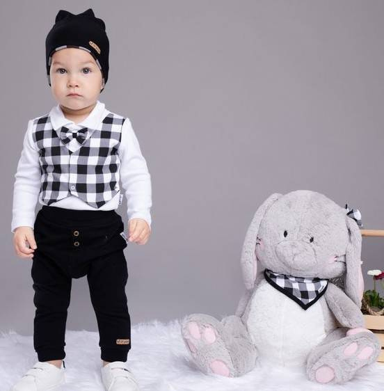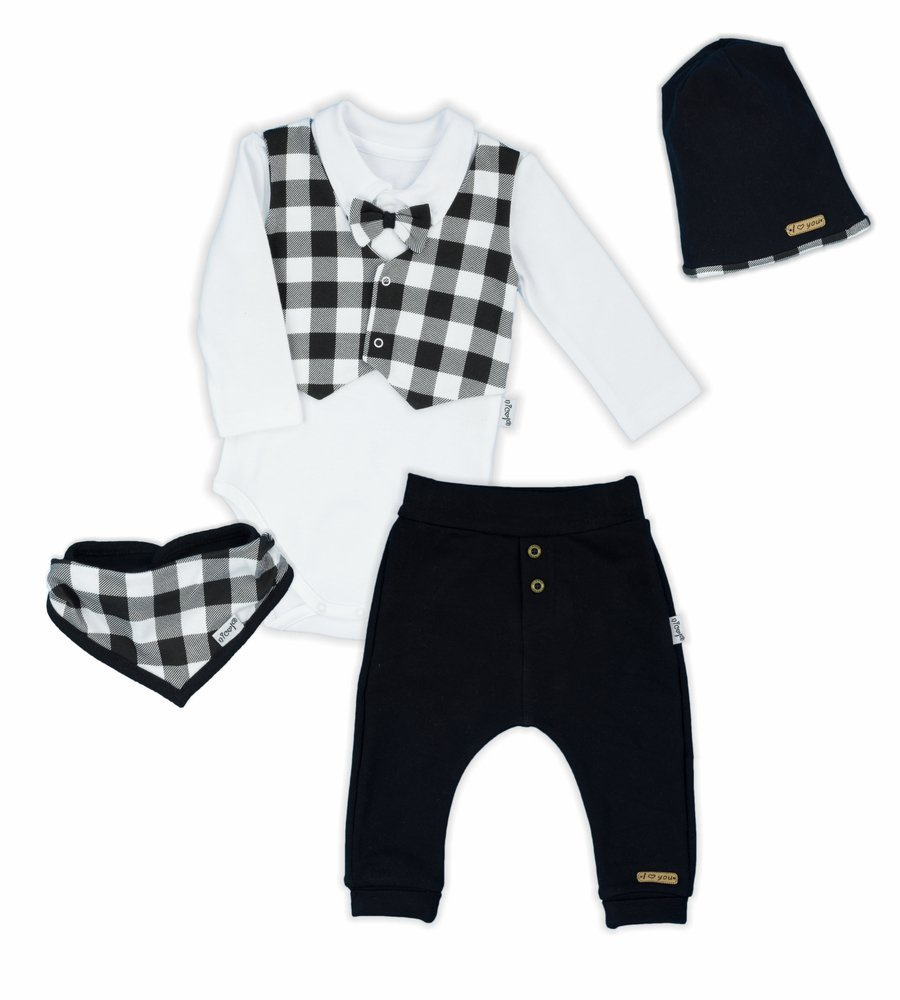 Komplet czapka, apaszka, body i spodnie 163353 "Bunny Kratka" Nicol - czarny/biały