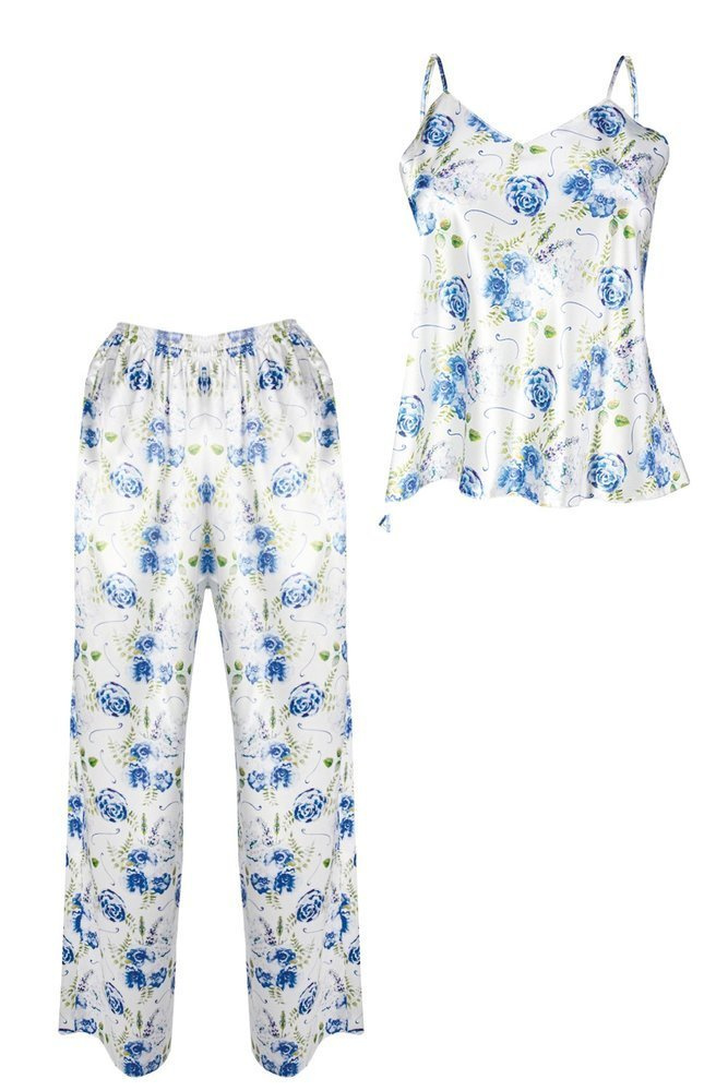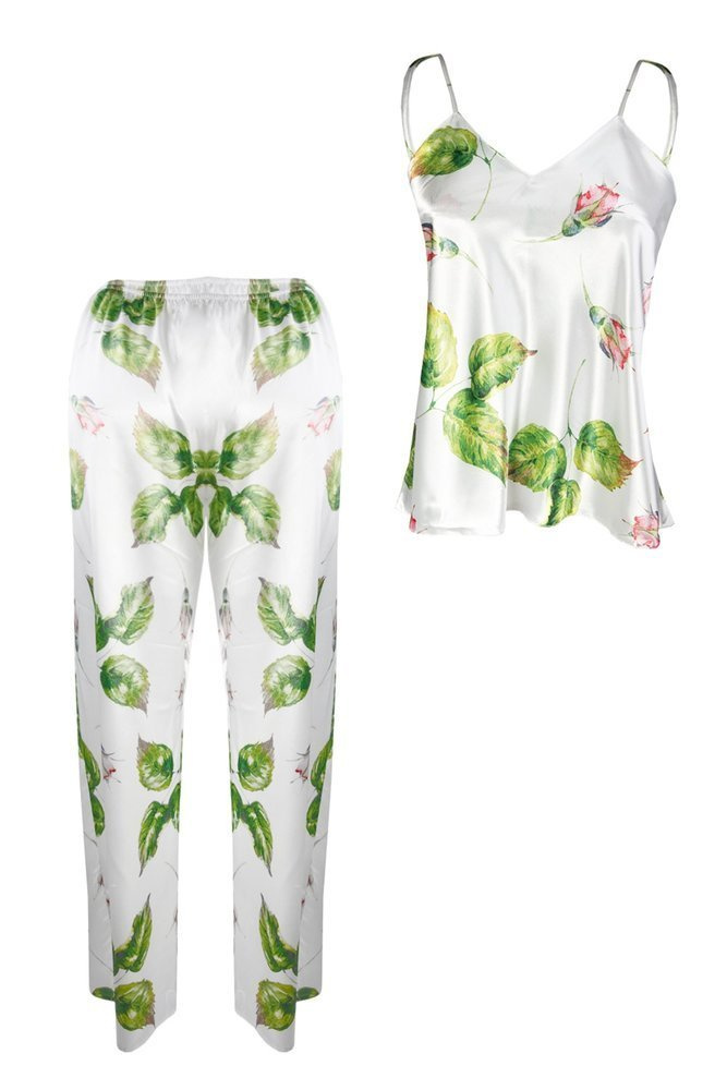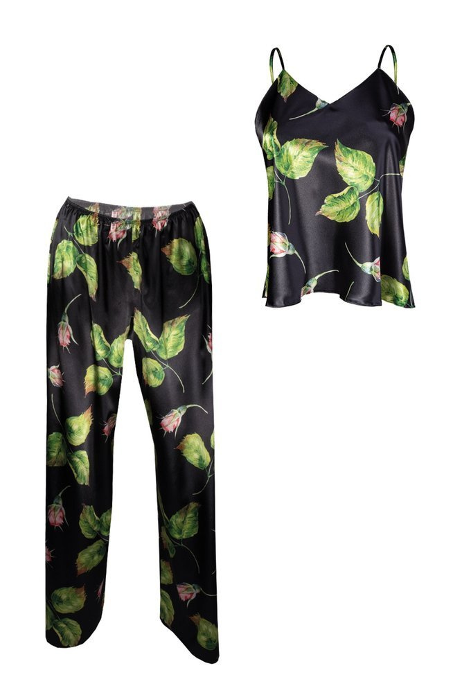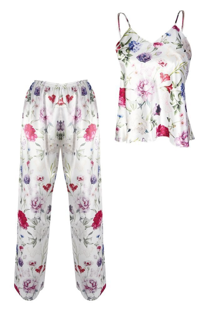 Zwiewny dotyk satyny utuli Cię do snu. Zmysłowy komplet FLOWERS składa się z koszulki oraz długich spodni. Góra koszulki posiada dekolt w kształcie litery "V". Dół kompletu wykończona zwiewną satyną. Do kompletu długie spodnie satynowe na cienkiej gumce.