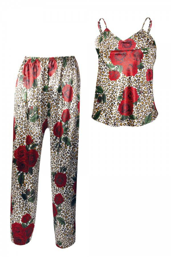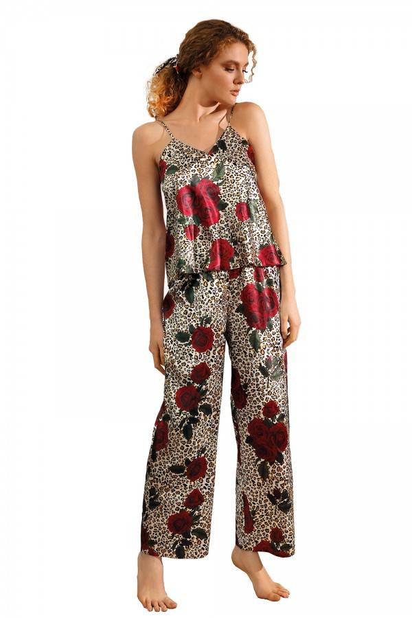Zwiewny dotyk satyny utuli Cię do snu. Zmysłowy komplet FLOWERS składa się z koszulki oraz długich spodni. Góra koszulki posiada dekolt w kształcie litery "V". Dół kompletu wykończona zwiewną satyną. Do kompletu długie spodnie satynowe na cienkiej gumce.