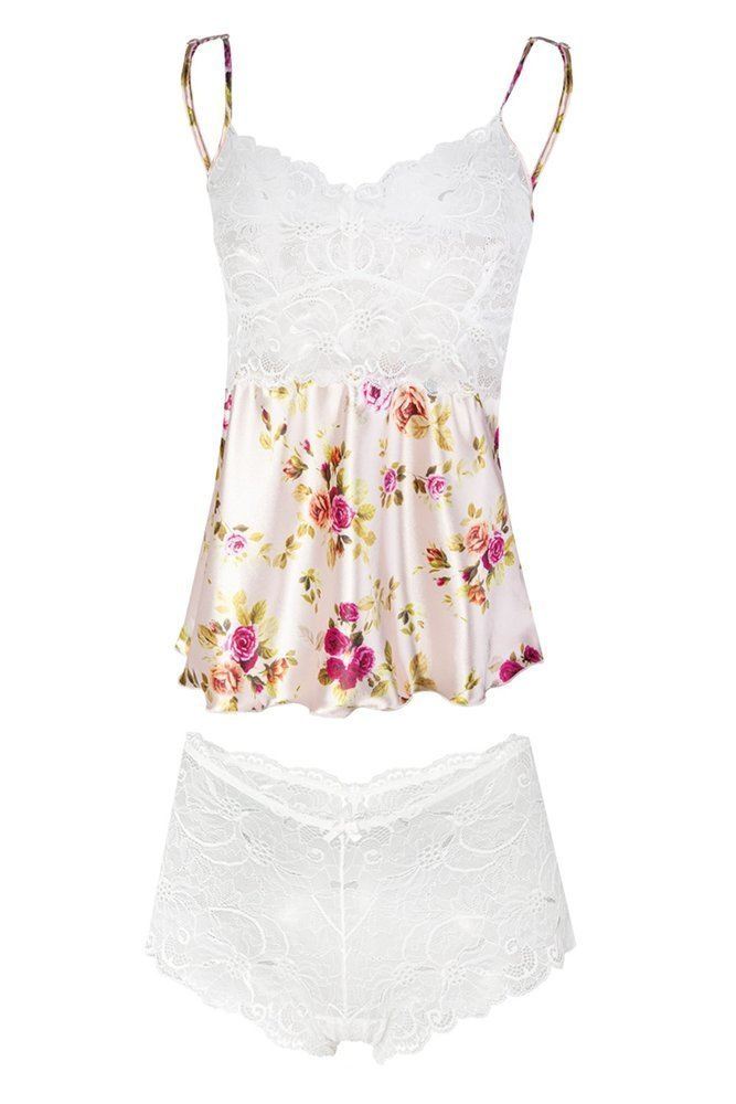 Góra koszulki została uszyta z elastycznej zmysłowej koronki natomiast dół został wykonany z delikatnej drukowanej wzorzystej satyny.