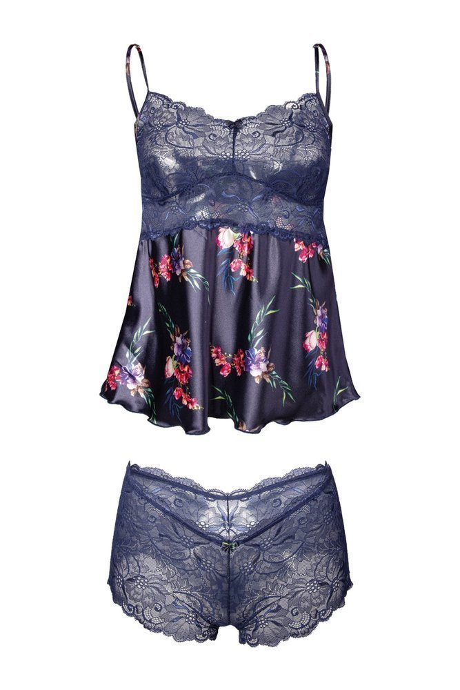 Góra koszulki została uszyta z elastycznej zmysłowej koronki natomiast dół został wykonany z delikatnej drukowanej wzorzystej satyny.