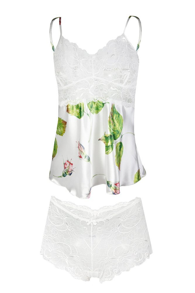 Góra koszulki została uszyta z elastycznej zmysłowej koronki natomiast dół został wykonany z delikatnej drukowanej wzorzystej satyny.