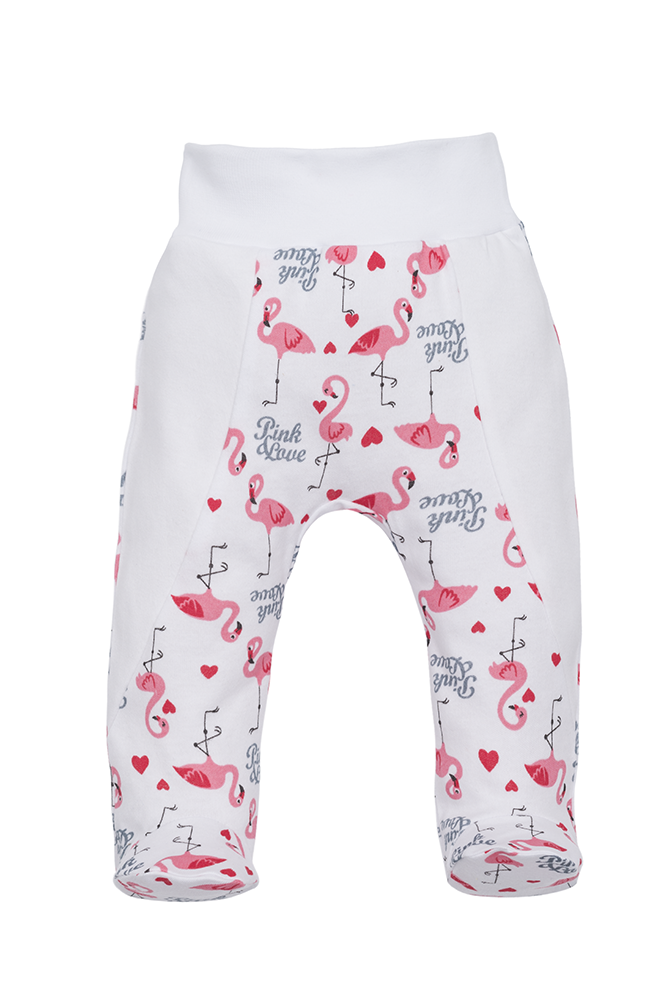 Półśpiochy niemowlęce uszyte z wysokogatunkowej bawełny w kolorze białym. Wykończone szerokim pasem z bawełnianego ściągacza, który nie uciska brzuszka dziecka. Dopełnienie kolekcji FLAMING.