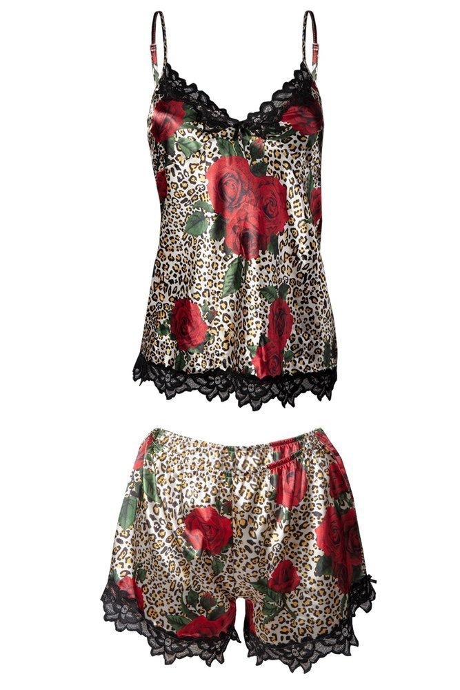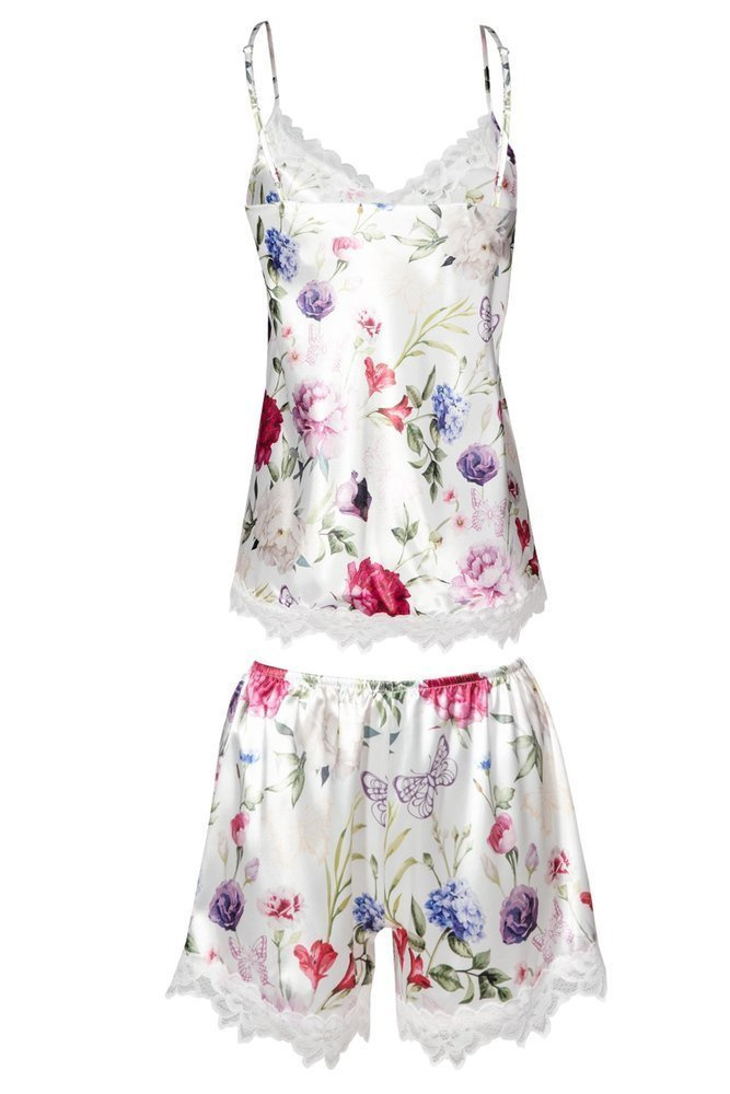 Efektowna piżama damska wykonana z delikatnej, przyjemnej dla ciała satyna. Koszulka na wąskich regulowanych ramiączkach. Głęboki dekolt wypełniony wstawką z efektownej koronki. W komplecie krótkie spodenki, o luźnym kroju również posiadają elementy ozdobne w postaci  koronkowych wstawek .