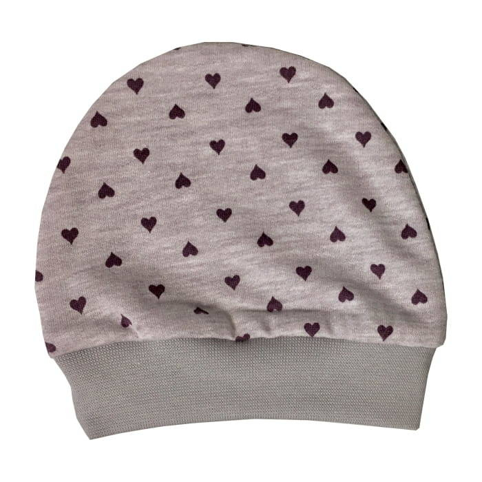 Czapeczka w kolorze szarym. Dzięki użyciu odpowiednich materiałów (100 % bawełny), czapka delikatnie dopasowuje się do kształtu głowy dziecka.