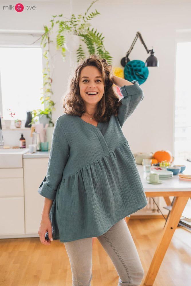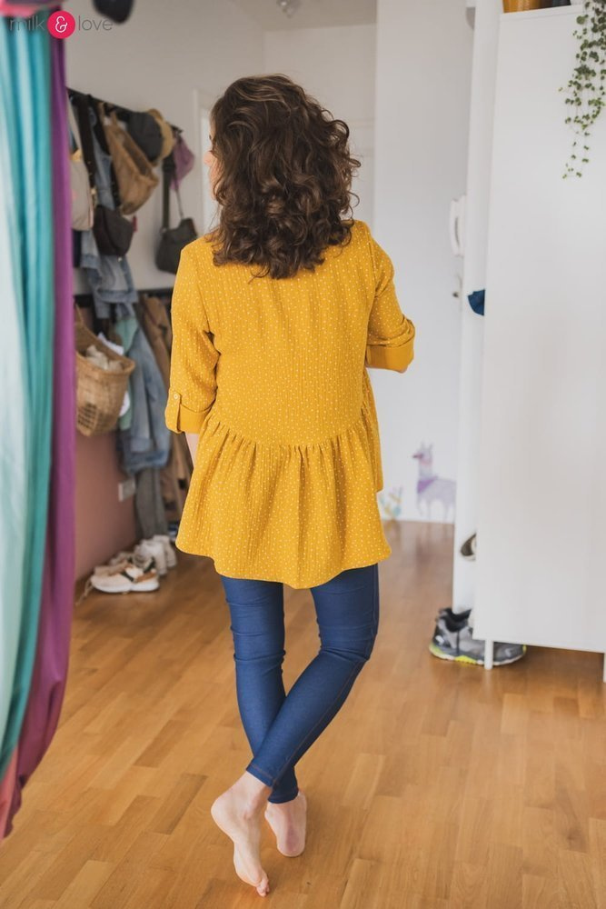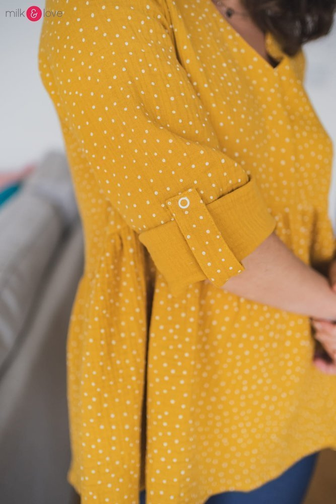 Kolejną właściwością muślinu bawełnianego jest termoregulacja. Otwarty splot włókien oddaje ciepło ciała na zewnątrz w przegrzanych pomieszczeniach i jednocześnie w chłodne dni działa termoizolacyjne. To dlatego właśnie z tego materiału powstają ubranka i akcesoria dla niemowląt, dla których stała temperatura otoczenia jest tak ważna. Długie rękawy, które możesz zawinąć na 3/4, wydłużony tył, który zasłoni plecy, kiedy się nachylasz.