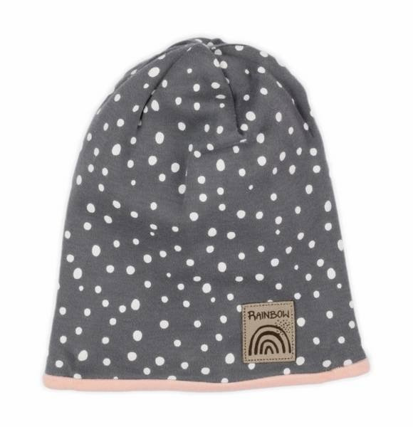 Modna czapka w kolorze grafitowym, we wzorki- kropki. Od środka podszyta bawełną z niewielką ilością elastanu, co sprawia, że czapka nie odkształca się.