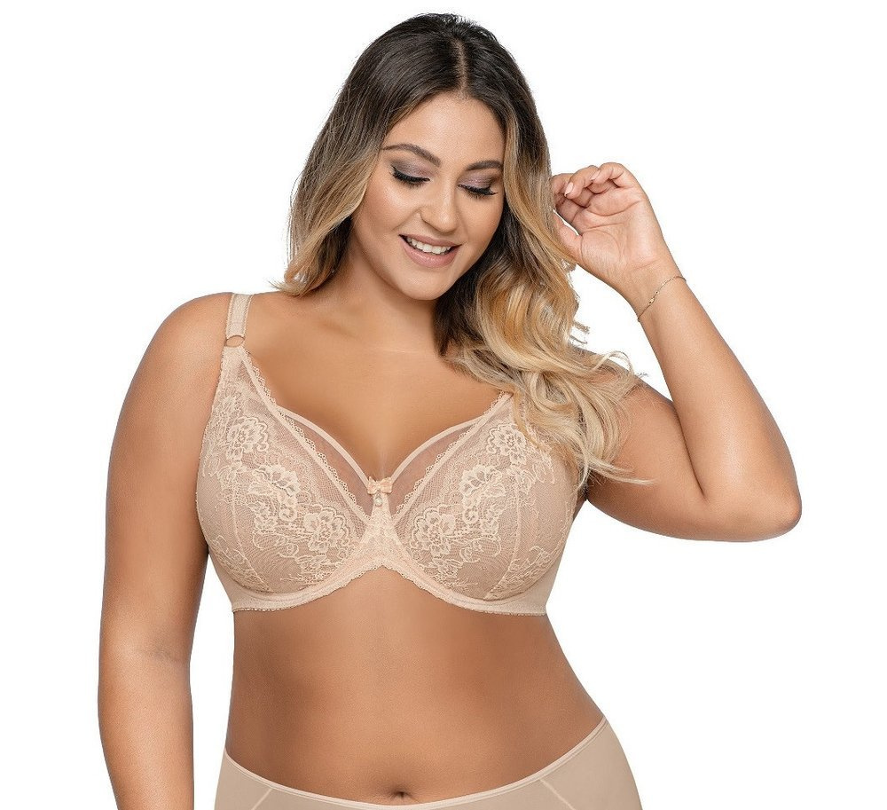 Zmysłowy biustonosz miękki z fiszbinami wykonany z podwójnej warstwy materiału, górna część miski z beżowego tiulu i efektownej delikatnej koronki.