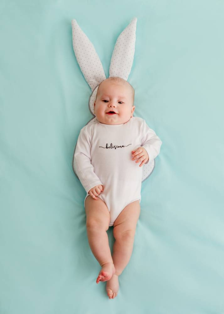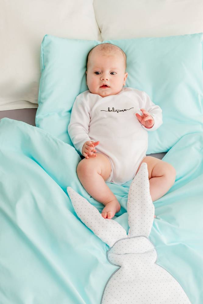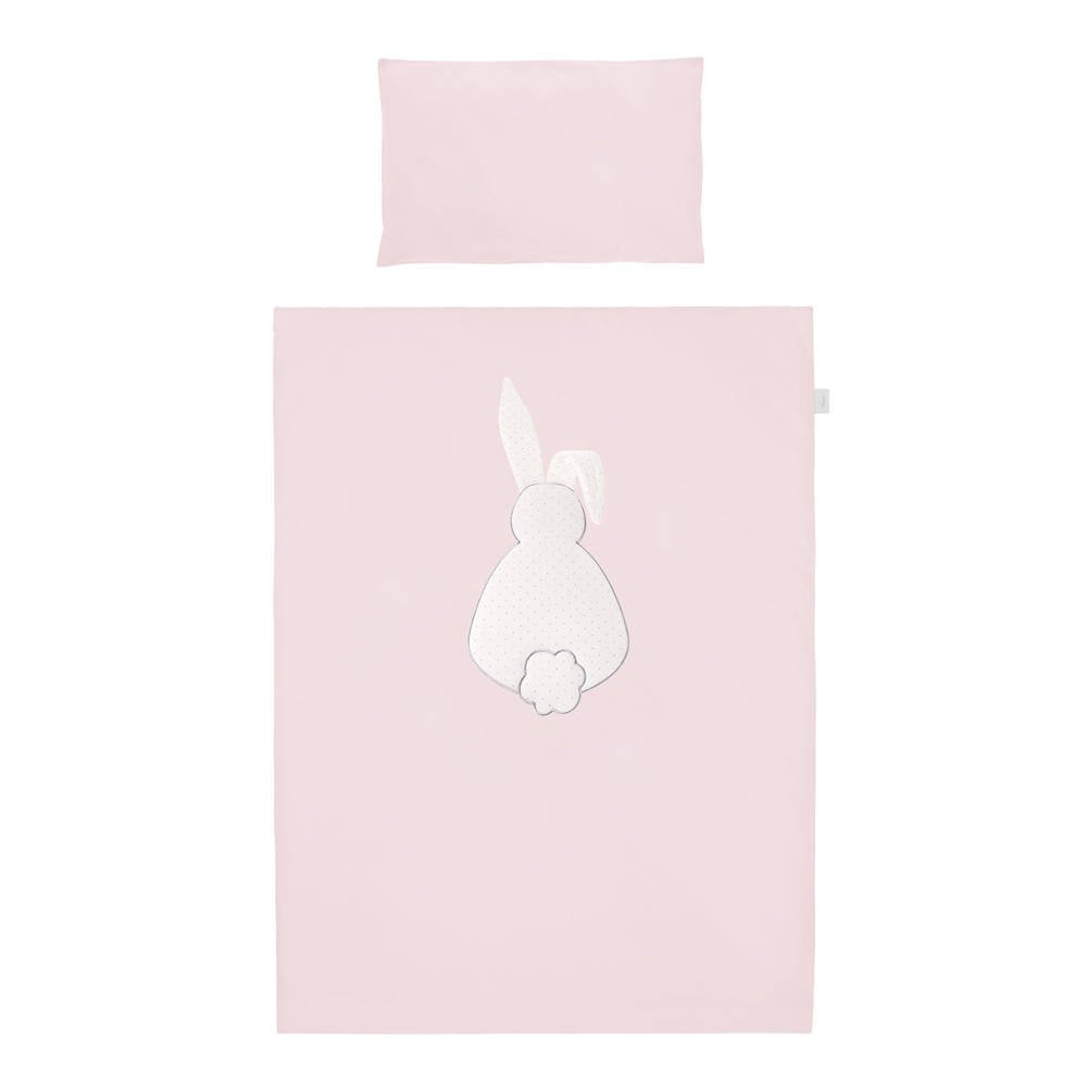 Na środku nadruk zajączka, pościel w trzech wersjach kolorystycznych.