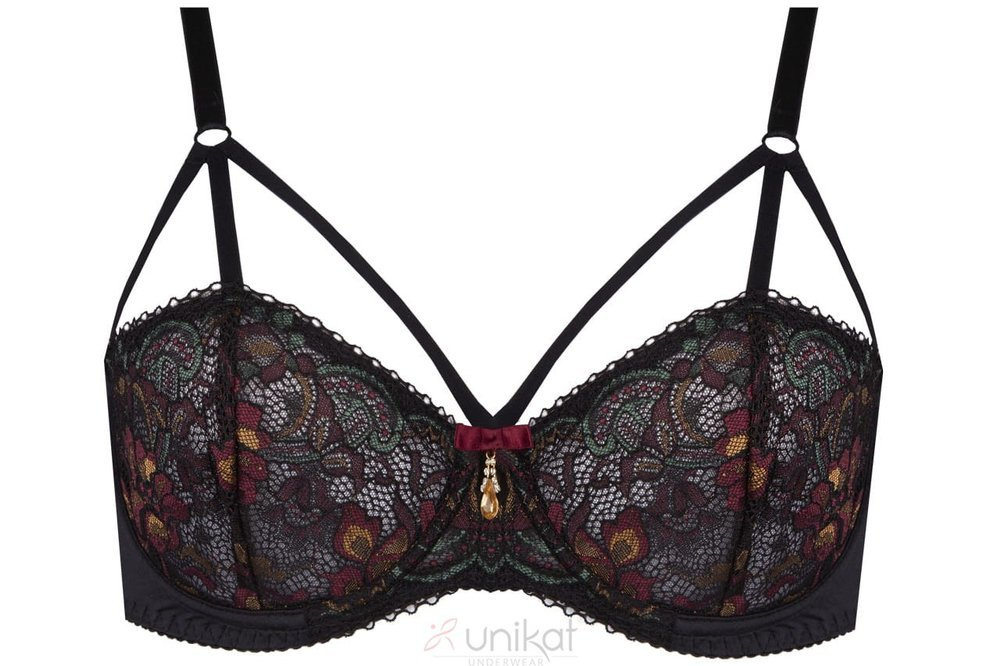 Candy to miękki biustonosz z fiszbinami. Połączenie kobiecego, lekko folklorystycznego, kolorowego wzoru z czernią. Sprawia, że piersi są doskonale podtrzymane i podniesione a co za tym idzie zapewnia atrakcyjny wygląd piersi. Model idealnie zbiera piersi. Dekolt zdobią modne od kilku sezonów strapsy z możliwością regulacji