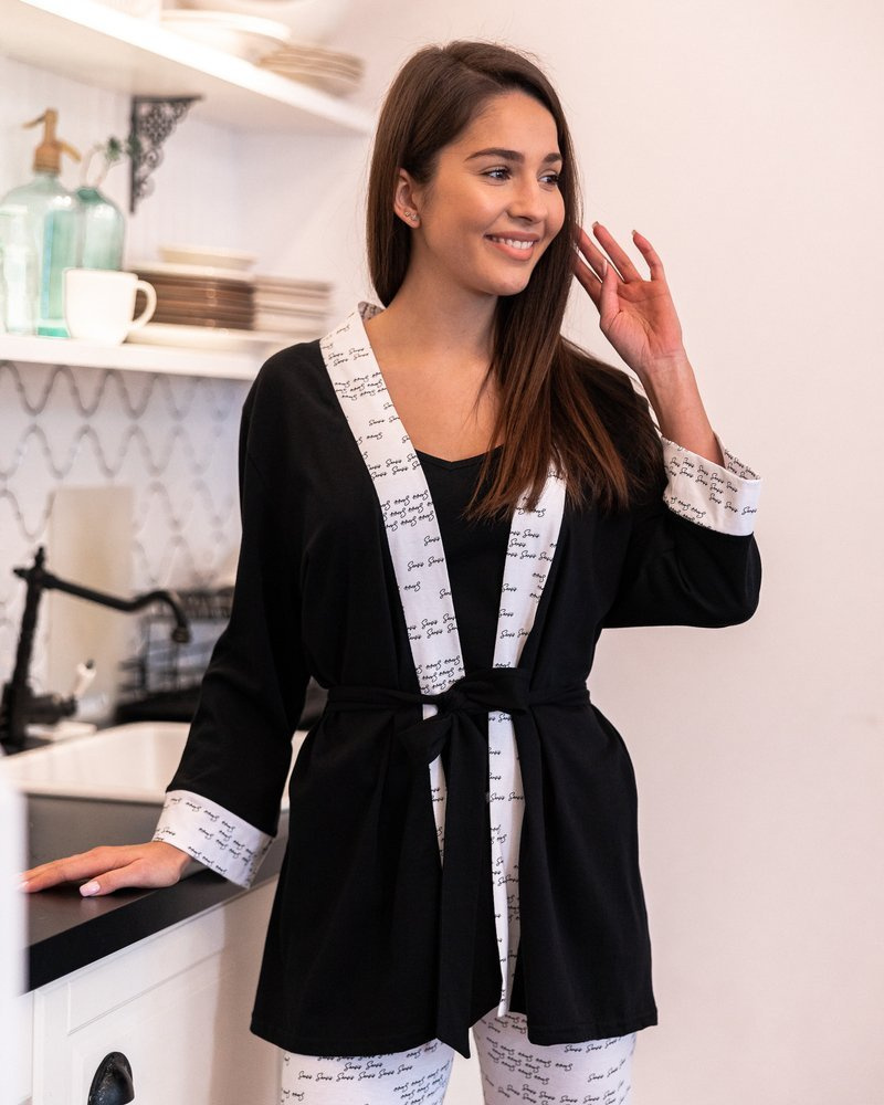 Klasyczny szlafrok damski z wysokiej jakości bawełny. Mankiety i przód obszyty wzorzystą dzianiną. Idealnie komponuje się z koszulą lub piżamą, dostępną w naszej kolekcji bielizny nocnej. W szlafroku możesz zachwycać i olśniewać swoją urodą, nawet jeśli tylko wybierasz się w nim do sypialni.