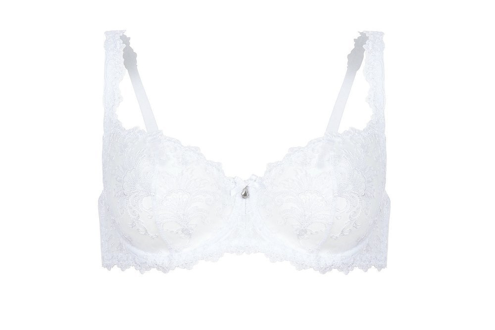 Nieodpinane, ozdobione delikatnym haftem ramiączka z możliwością regulacji i kilkustopniowe zapięcie gwarantują idealne dopasowanie. Miseczki zostały wzmocnione tiulem umieszczonym po bokach. Dla lepszego efektu konstrukcję usztywniono fiszbinami.