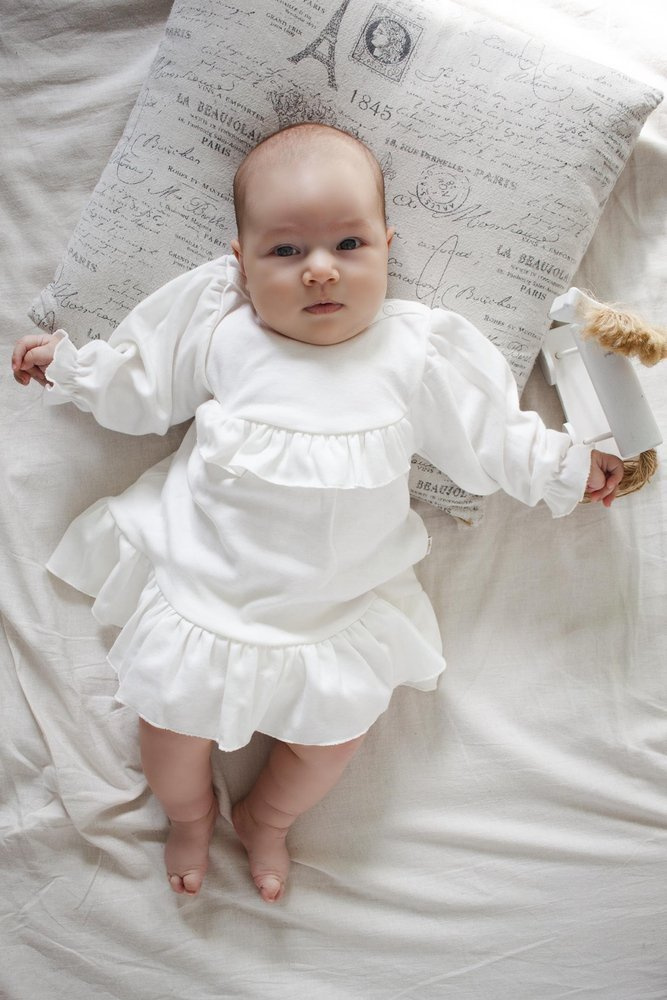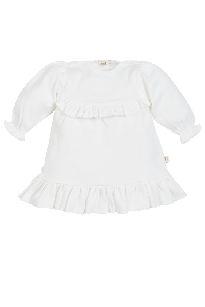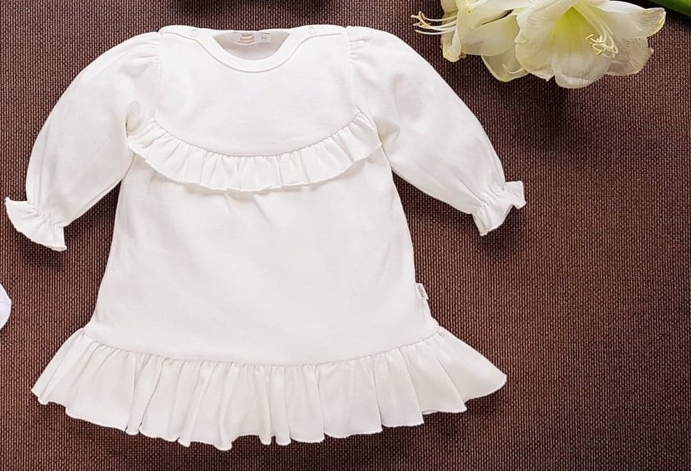 Urocza, dziewczęca sukienka, wykonana z 100% bawełny. Z przodu ozdobiona falbanką. Sukienka bardzo ładnie komponuje się z pozostałymi ubrankami z kolekcji Jasmina.