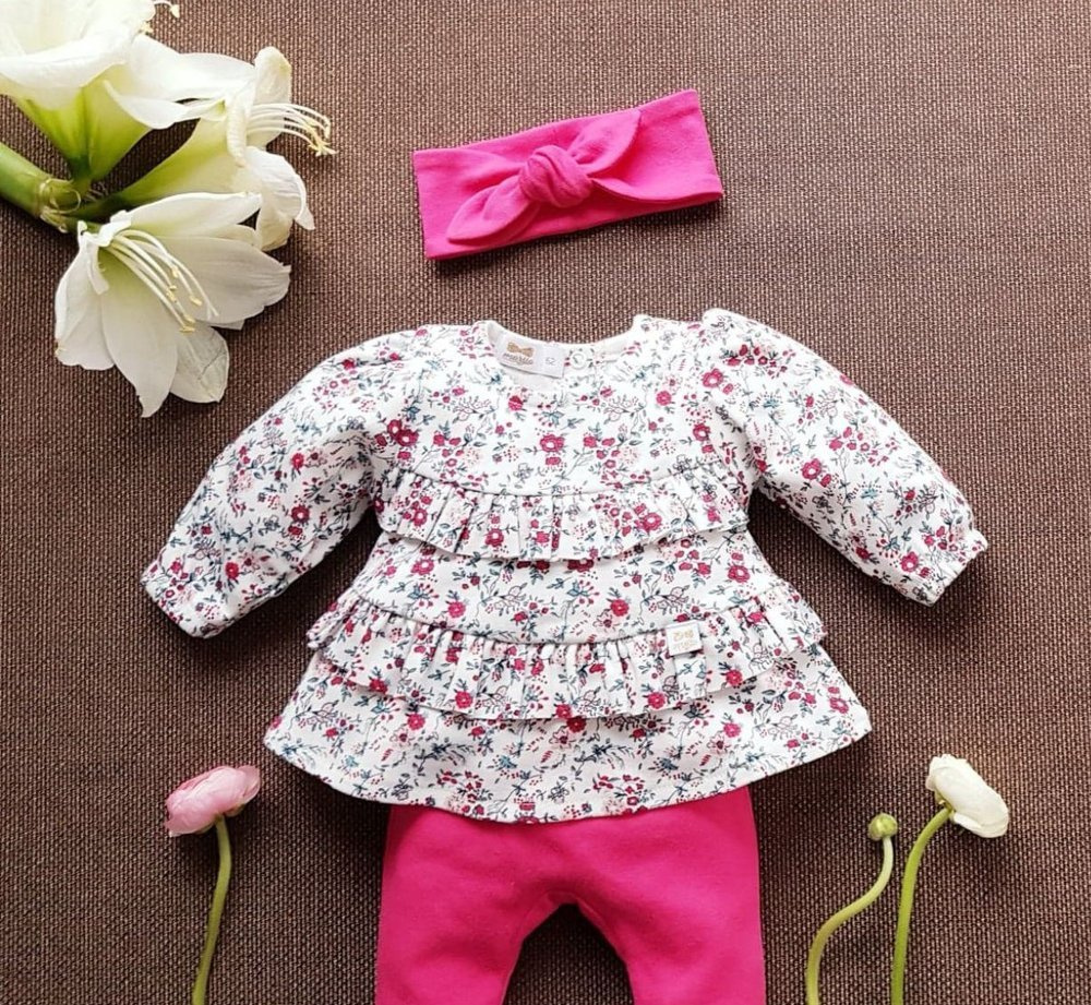 Zestaw niemowlęcy, który składa się z tuniki, opaski i legginsów. Każdy z produktów jest pakowany osobno. Ubranka wykonane ze 100% mięciutkiej bawełny zapewnią zadowolenie każdego z naszych Milusińskich.