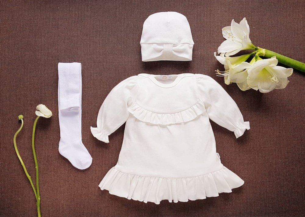 Zestaw niemowlęcy, który składa się z czapeczki, sukienki i raajstop. Każdy z produktów jest pakowany osobno. Ubranka wykonane ze 100% mięciutkiej bawełny zapewnią zadowolenie każdego z naszych Milusińskich.