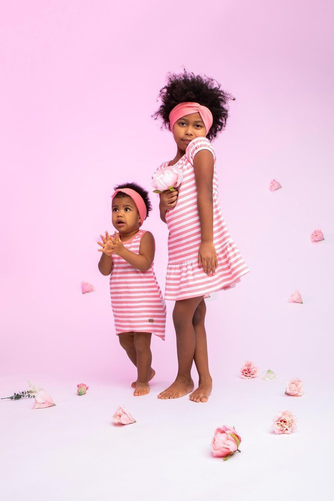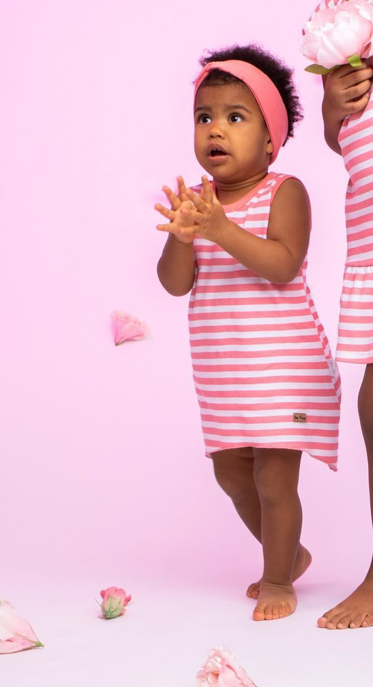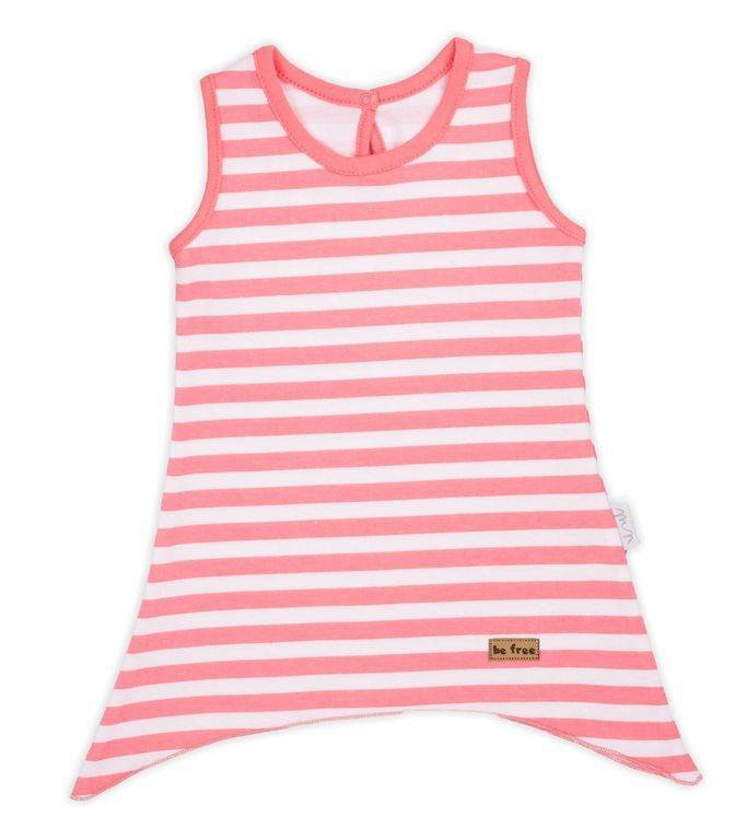 Modna sukienka na ramiączkach, na lato dla dziewczynki wykonana z białej bawełny w koralowe paski, dół sukienki został lekko rozkloszowany. Przód dopełnia skórka. Materiał jest całkowicie bezpieczny dla skóry dziecka.